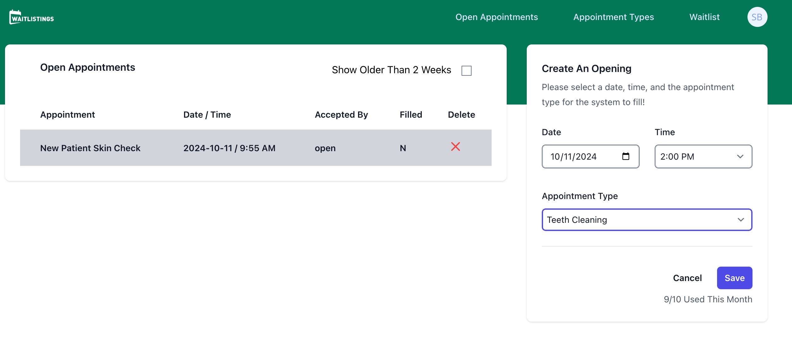 Stop losing revenue to no-shows and last-minute cancellations. With WaitListings, patients on your waitlist are automatically notified the moment a spot opens up—first to confirm gets it.